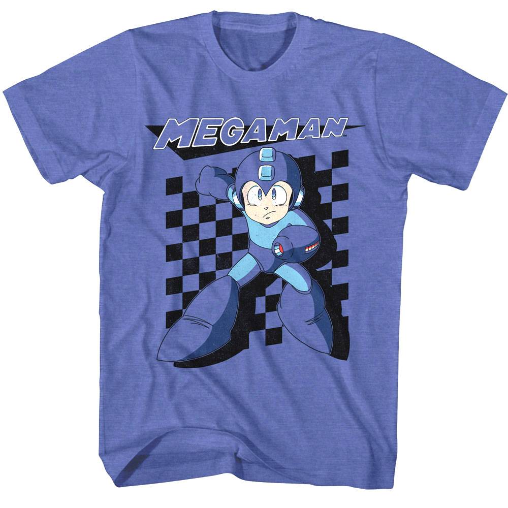 Capcom had yet another hit with Mega Man, who starred in a series of robot characters all known as Megaman (or Rokkuman in Japan). Having appeared on many gaming systems since his first appearance on NES Nintendo Entertainment System in 1987, Mega Man has had a wide gaming audience, but he is still battling the evil Dr Wily with his trusty pets. If you are a retro gamer then this vintage style graphic Megaman Checkered Flag t-shirt is for you, featuring your favorite old-school characters.