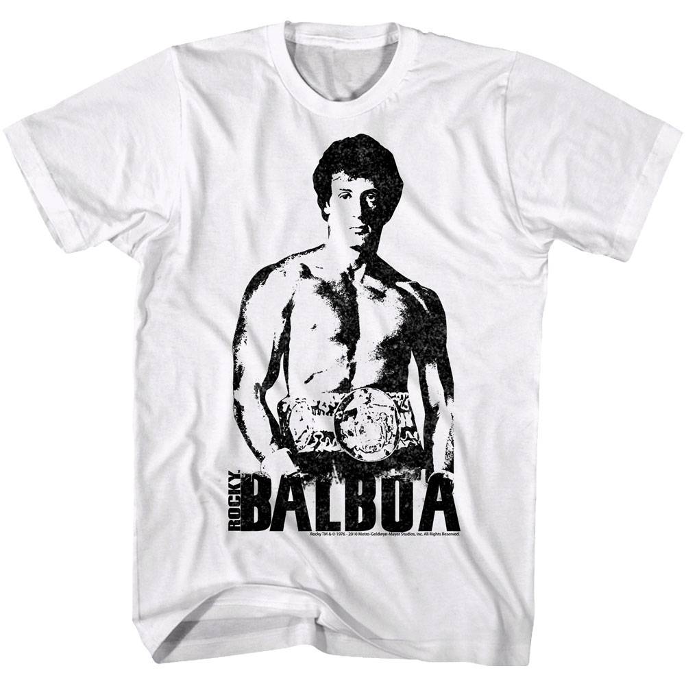 The greatest boxing movie franchise in film history! There are 6 movies following Rocky Balboa (played by Sylvester Stallone) fighting his way up from the streets to the big time. This is followed by the Rocky Creed movies, where Rocky becomes coach and mentor to Adonis Creed (the son of nemesis Apollo Creed). The original 6 movies were mostly written and directed by Sly Stallone himself. Legendary movies, memorable characters, invoke the heroic strength of Rocky Balboa with this inspirational boxing Rocky Balboa Towering Champion t-shirt