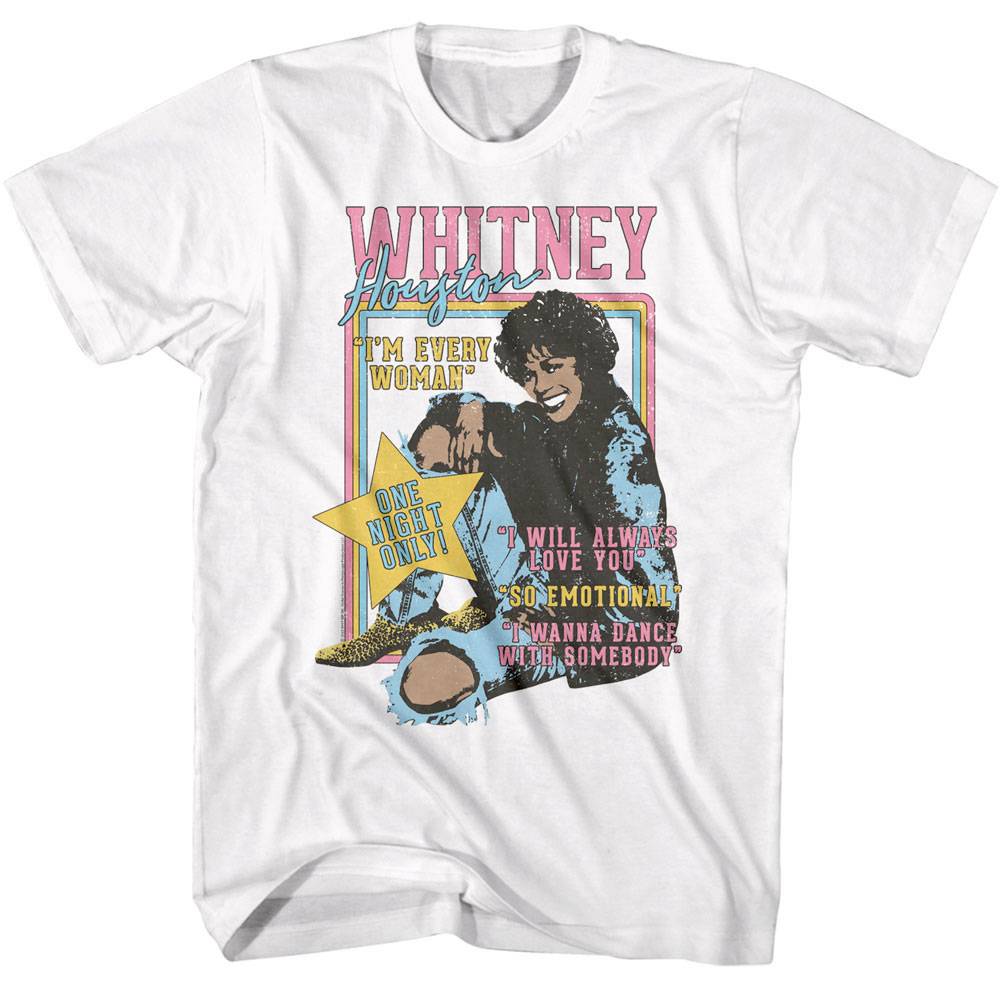 As the song goes, Whitney Houston is Every Woman! She is one of the best-selling recording artists of all time, with sales of over 200 million records worldwide. Whitney was a Pop Music Icon, mixing her powerful gospel sound with her with pop vibes and you got multiple Number 1 hits. She added to her legendary status by stepping into movies, her acting and singing was a Box Office success too (The Bodyguard her most successful). Privately, her turbulent personal life and her rocky relationship with ex-husband Bobby Brown lead to frequent drug use – this all contributed to her tragic end in 2012. Whitney’s legacy is that she will always be known for her immense vocal range and powerful ballads. If you were a 90’s kid, wear this Whitney Houston One Night Only T-Shirt as a statement with a look that says I’m from the 90’s.